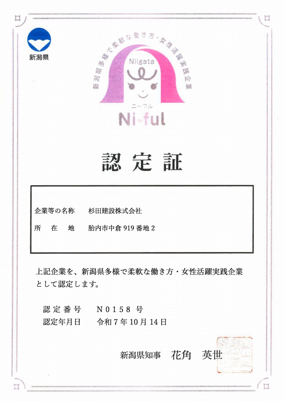 多様で柔軟な働き方の推進や仕事と家庭・その他の活動の両立支援、女性の登用・育成などに積極的に取り組む企業として「新潟県多様で柔軟な働き方・女性活躍実践企業(Ni-ful)」に登録・認定されました。