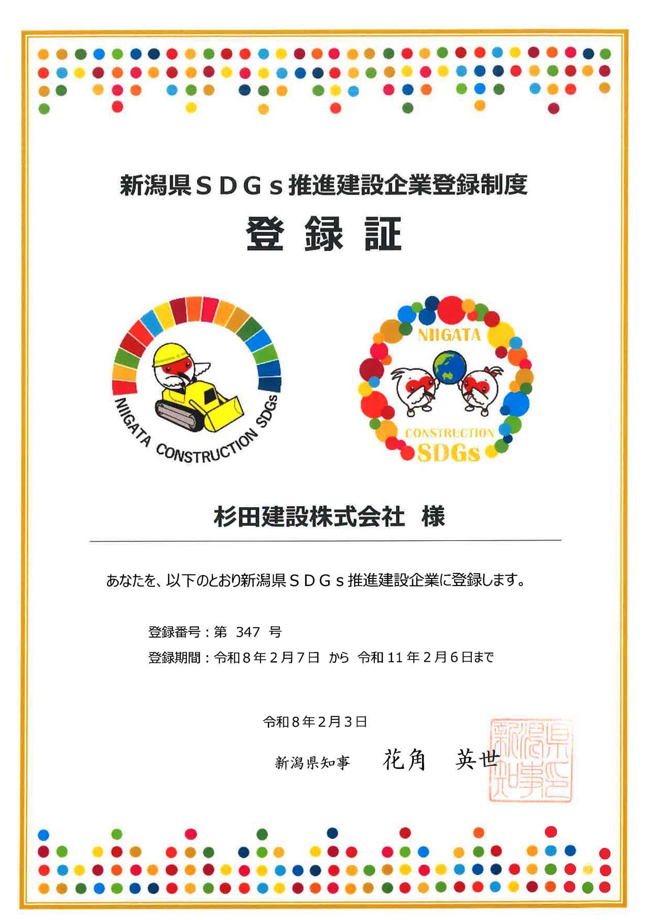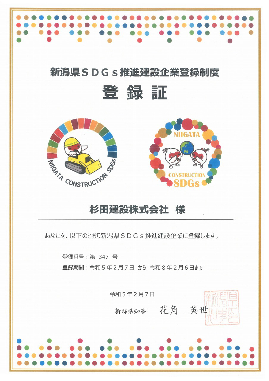 SDGsの推進に取り組む建設企業として「新潟県SDGs推進建設企業」に登録・認定されました。